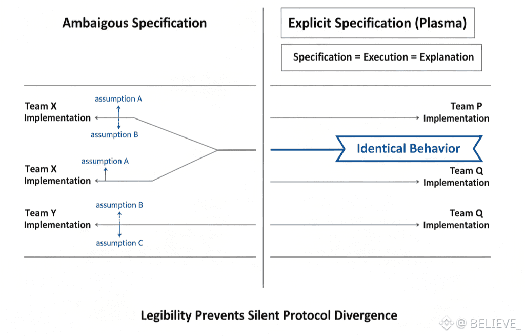 In most blockchains, clarity is layered on later. Whitepapers explain intent. Blog posts explain changes. Community members explain behavior. Over time, these explanations diverge. Plasma collapses that separation. Specification, execution, and explanation are tightly aligned. The protocol is built to be read as much as it is built to run.