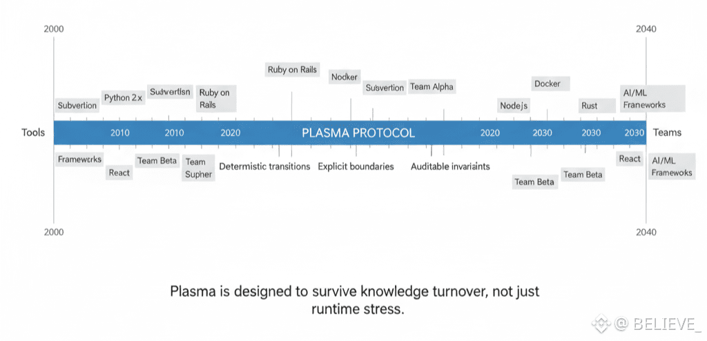 In practice, this reduces reliance on trust-by-familiarity. Stakeholders do not need to “know the team” or “understand the culture” to evaluate Plasma. They can evaluate the system itself. That is a critical property when systems are expected to operate across organizations, borders, and generations of contributors.