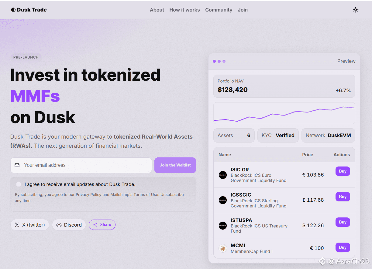 Today, all of this comes together in products like Dusk Trade. This is a regulated trading platform built with NPEX that brings tokenized assets and funds on‑chain. The platform is opening through a waitlist and early access phase, signaling the transition from infrastructure to real user‑facing markets. This is where years of design choices start to show their value.