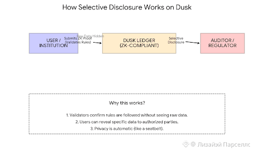 Dusk Network lives inside this conflict. It’s a public blockchain that wants confidential smart contracts, but still usable in regulated setups. The idea is selective disclosure: transactions stay private by default, but proof can be shown when required. Zero-knowledge cryptography is the backbone here—rules can be enforced and verified without exposing raw data. This is what Dusk calls its “privacy plus compliance” approach, pushed through things like Zero-Knowledge Compliance.