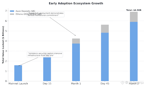 That commitment creates dynamics worth watching. Validators who join Plasma aren't looking for quick flips necessarily. They're betting on multi-year adoption curves where payment usage grows enough to justify infrastructure investment. You can see this in the partnerships. Aave deployed within 48 hours of mainnet, hitting $5.9 billion in deposits immediately. Ethena launched USDe and sUSDe with $1 billion in capacity. These aren't hobby integrations. Someone coordinated serious liquidity commitments before launch.