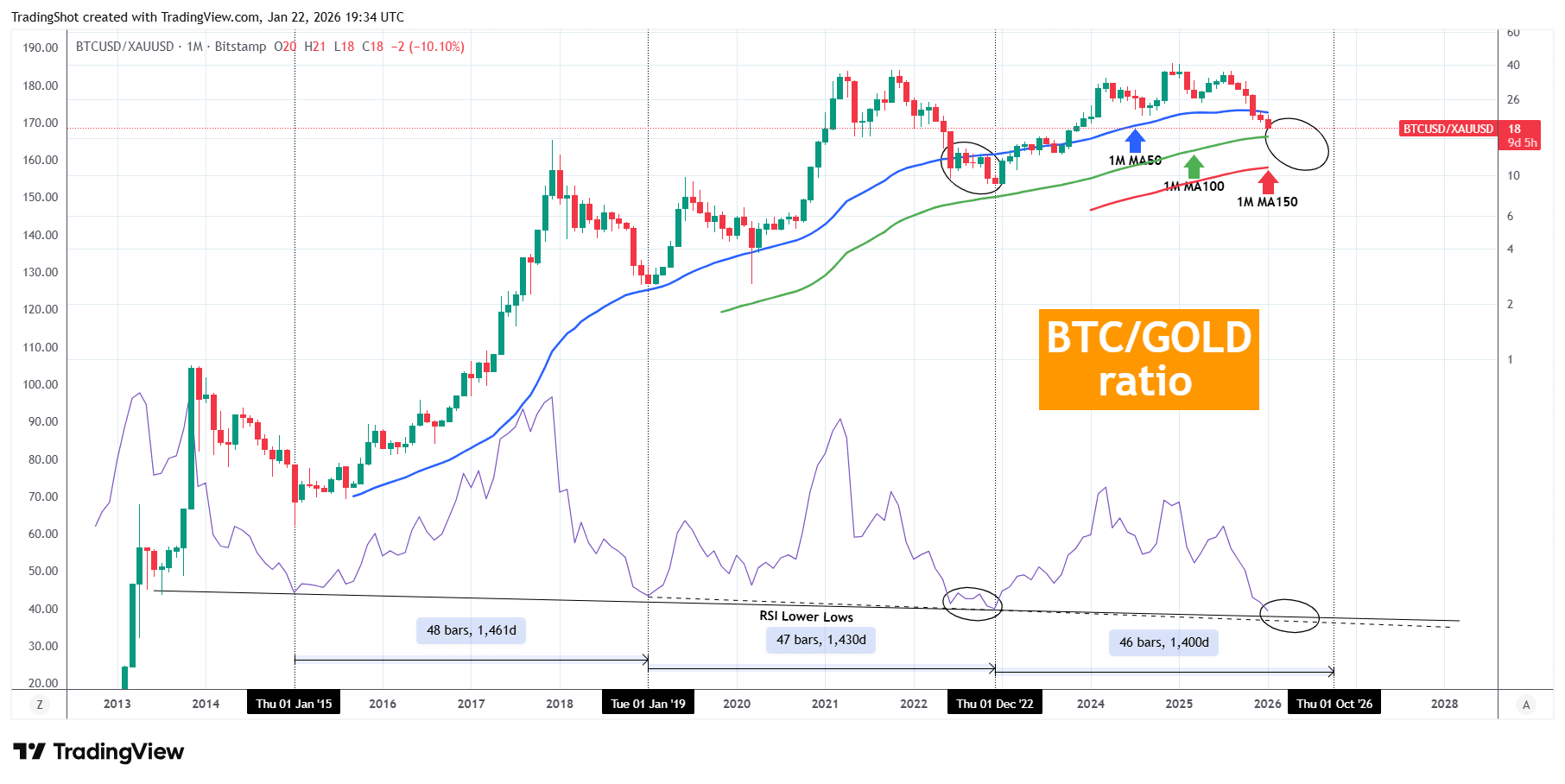 Das zeigt, dass der Boden näher sein könnte, als wir erwarten, aber der letzte Bärenzyklus zeigte ein langsameres Verhalten, als er sich den RSI niedrigeren Tiefs näherte und seitwärts ging, bevor er schließlich 6 Monate später damit in Kontakt trat. Für die tatsächliche BTC/GOLD-Preisdynamik jedoch verlangsamte sich der Abwärtstrend nicht so sehr, sondern brach zuerst gewaltsam unter dem 1M MA50 (blaue Trendlinie) und fand 6 Monate später den Boden wie gerade oben erwähnt über dem 1M MA100 (grüne Trendlinie).