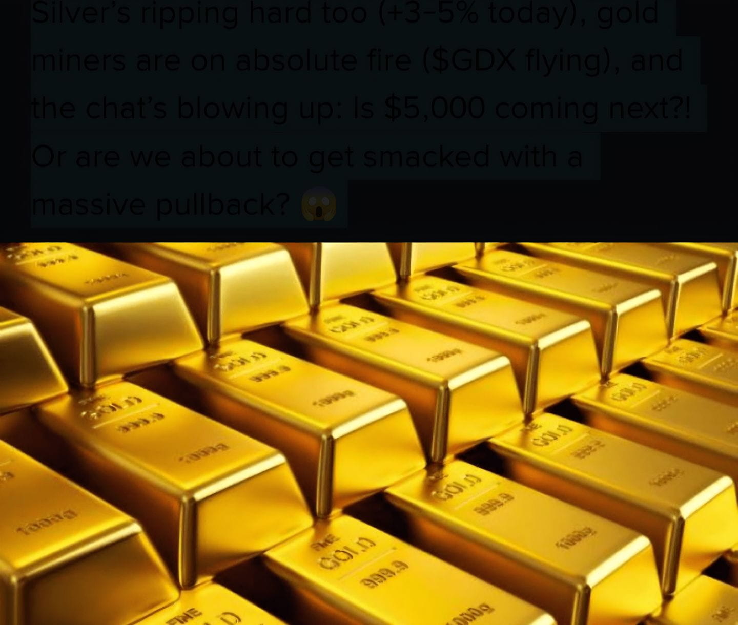 Silver’s ripping hard too (+3-5% today), gold miners are on absolute fire ($GDX flying), and the chat’s blowing up: Is $5,000 coming next?! Or are we about to get smacked with a massive pullback? 😱