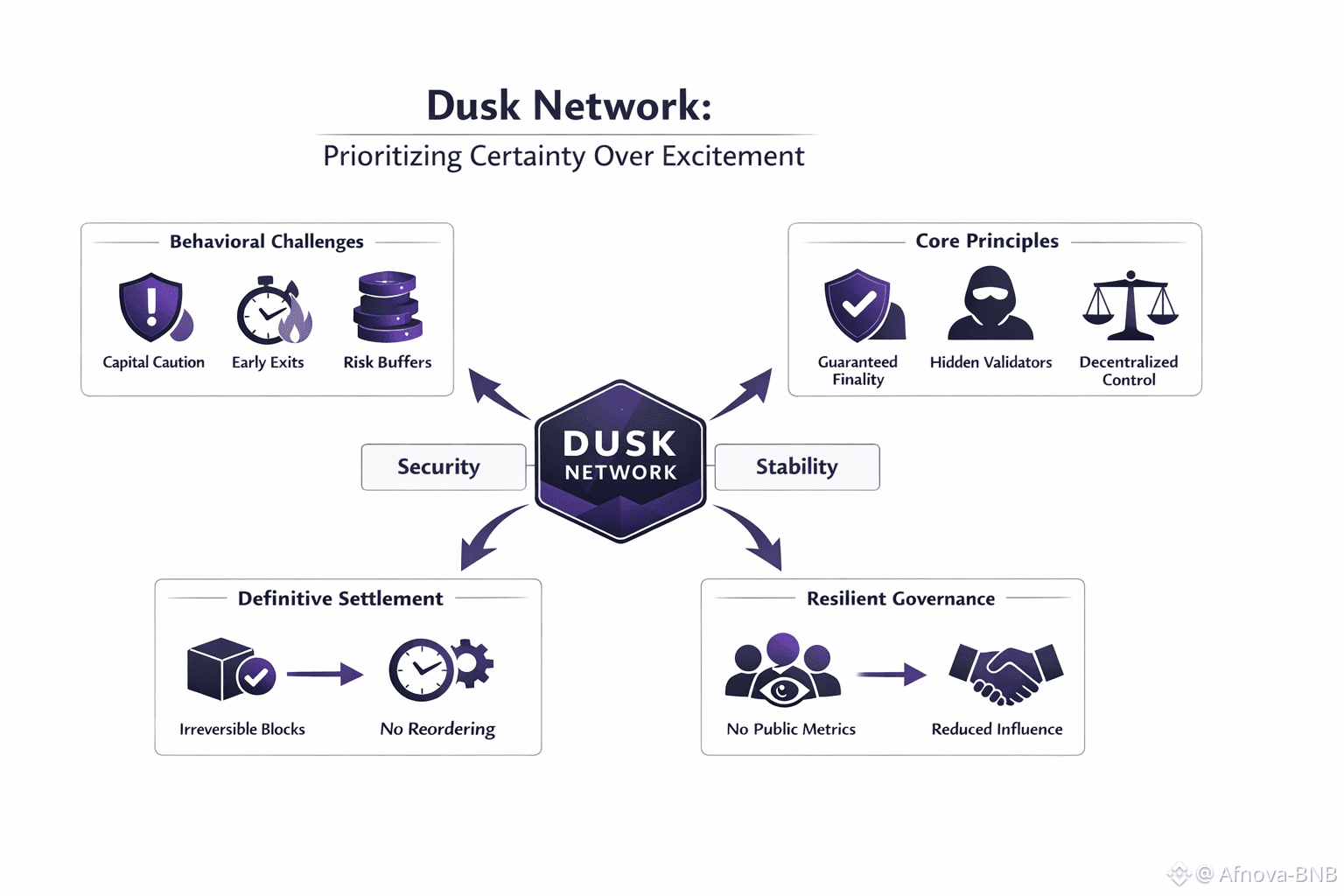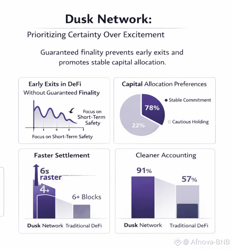 @Dusk Network starts from a reality most systems prefer to gloss over uncertainty carries a real, behavioral cost. Long before it shows up in risk models, it reshapes how people act. When outcomes can be undone even slightly participants adjust defensively. Capital slows. Risk teams add buffers that never quite disappear. Traders exit positions earlier than fundamentals justify, not because conviction fades, but because time itself becomes a source of danger. Over repeated cycles, this mindset hardens. Preservation overtakes participation, and long-term commitment gives way to short-term caution.