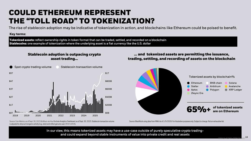BlackRock erklärt, dass Ethereum ($ETH) die unverzichtbare Infrastruktur für die Tokenisierung werden könnte, wie eine „Mautstraße“, durch die tokenisierte Finanzanlagen fließen würden. Die Tatsache, dass über 65 % der tokenisierten Vermögenswerte bereits auf Ethereum emittiert werden, zeigt, dass Institutionen es nicht aus Spekulation nutzen, sondern weil es ein Niveau an Sicherheit, Standardisierung und Programmierbarkeit bietet, das den regulatorischen Anforderungen entspricht. Die Stablecoins sind der erste großflächige Beweis dafür: Ihre Volumina übersteigen mittlerweile den traditionellen Krypto-Handel und zeigen, dass die finanziellen On-Chain-Schienen funktionieren. Von dort aus kann sich die Tokenisierung auf komplexere Vermögenswerte wie Anleihen, private Kredite oder reale Vermögenswerte ausdehnen. Die wesentliche Implikation ist, dass Ethereum sich nicht mehr als einfache Krypto-Blockchain positioniert, sondern als grundlegende Finanzinfrastruktur, mit den L2 für die Ausführung, während der Wert sich auf der Abwicklungsebene konzentriert.