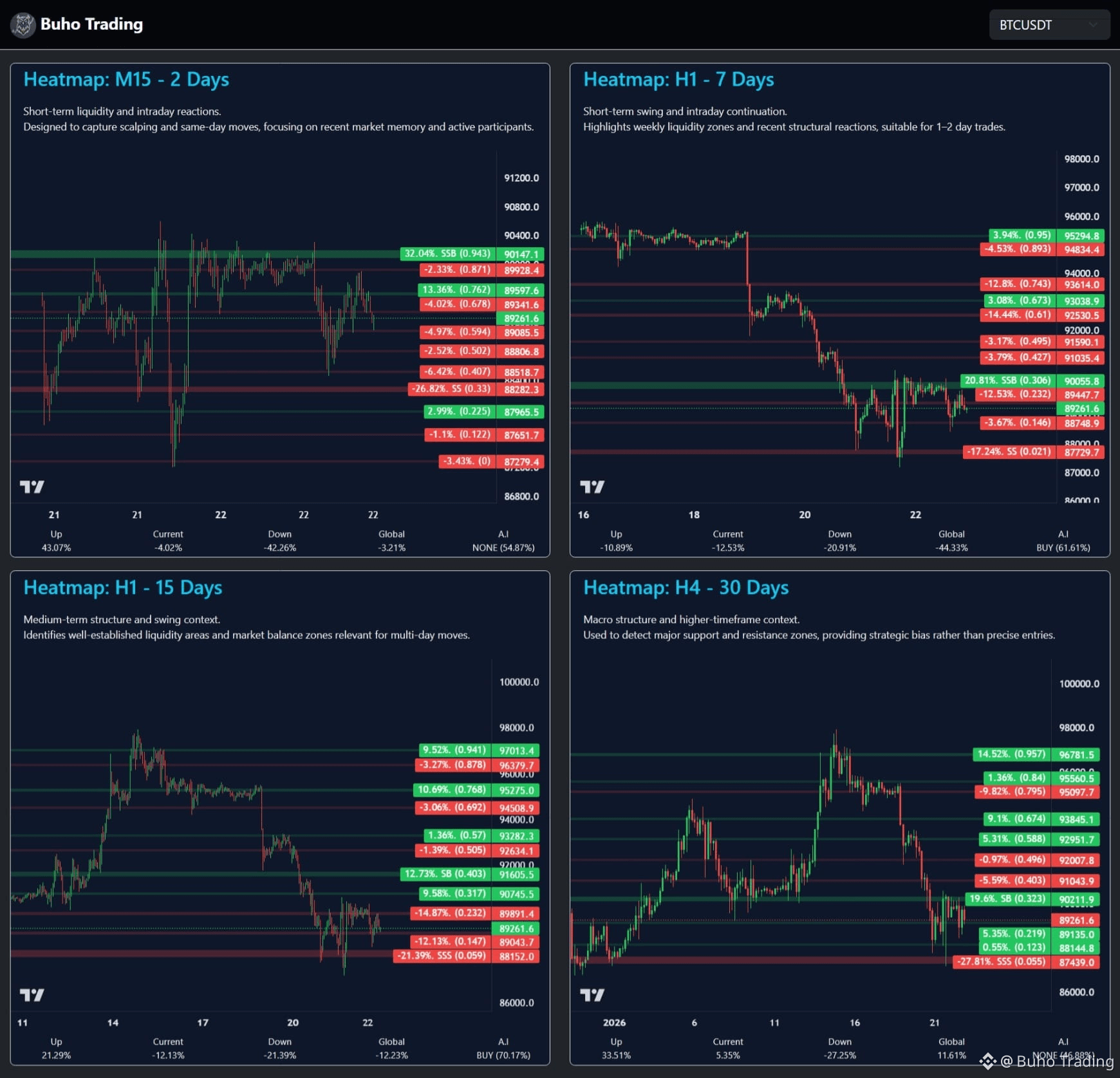En la vista de mapa de calor a 2 días, BTC se encuentra prácticamente en equilibrio entre fuerzas compradoras y vendedoras.