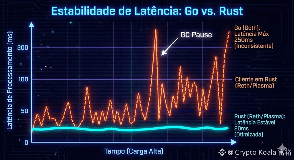 Quando o mercado fica volátil e todo mundo corre para vender ou comprar, as redes baseadas em Geth/Go começam a sofrer com a pressão na memória, o Garbage Collector trabalha dobrado, e a rede fica lenta.