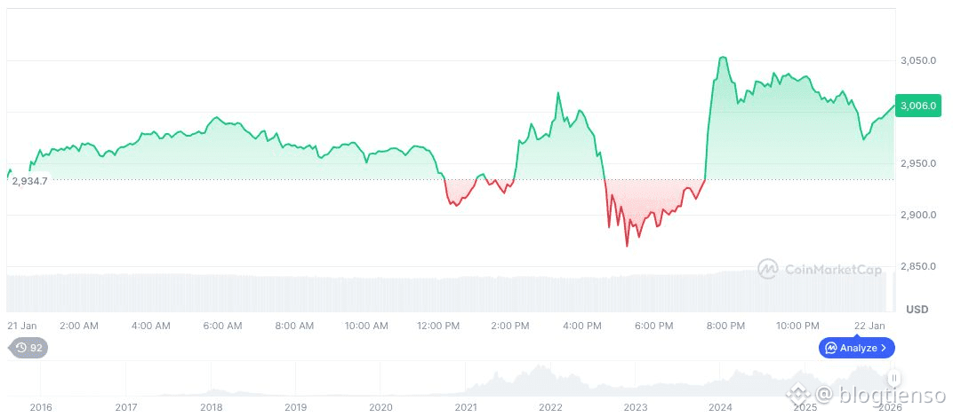 Theo cập nhật mới nhất từ CoinMarketCap, giá Ethereum (ETH) đạt 2.946,63 USD, phản ánh vốn hóa thị trường là 355,64 tỷ USD với tỷ lệ thống lĩnh thị trường là 11,79%.
