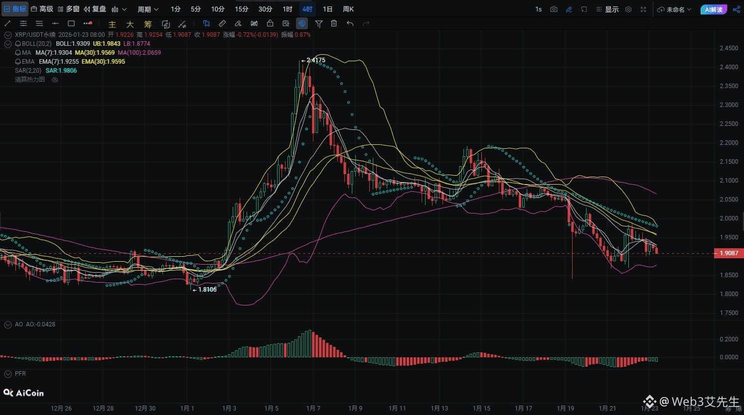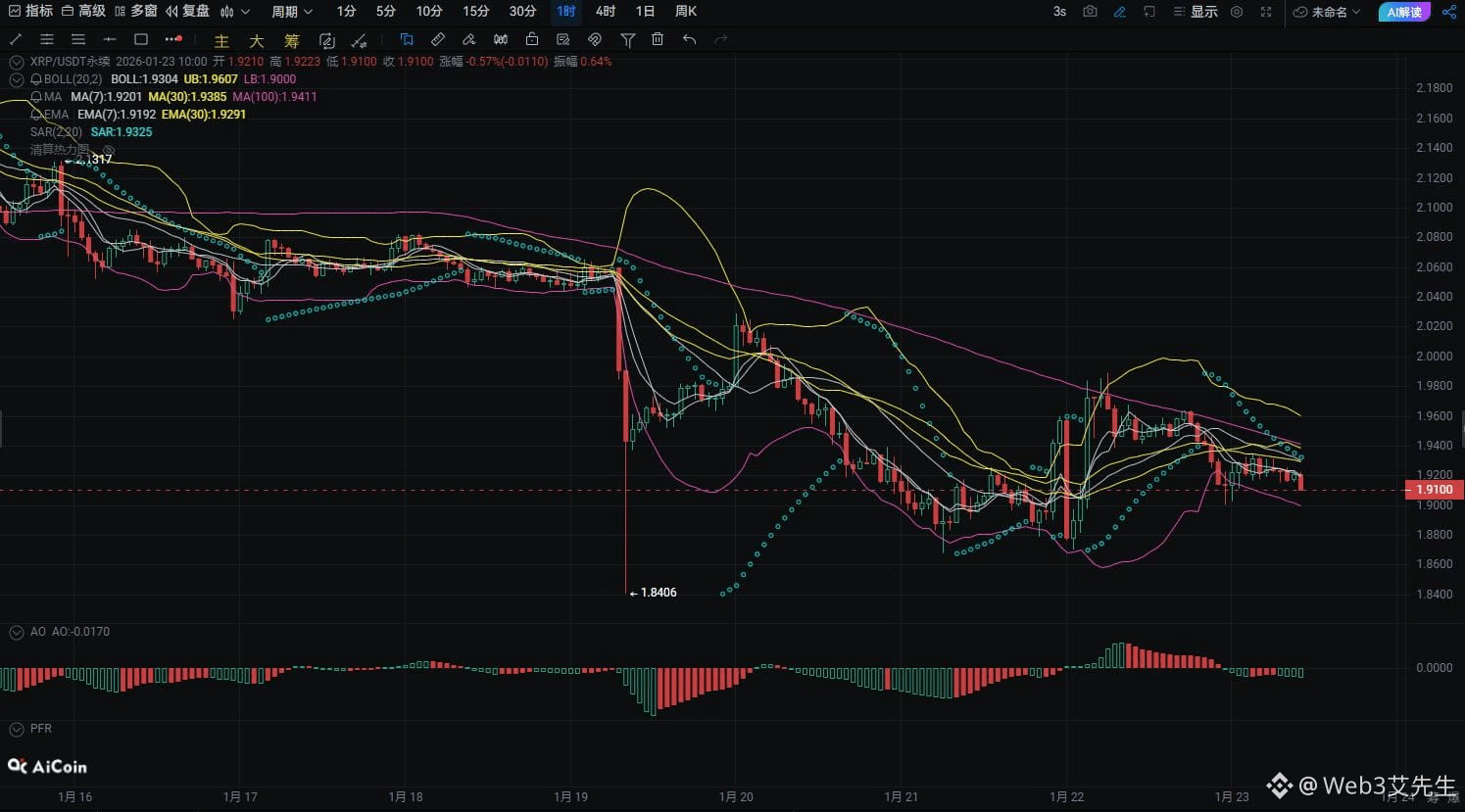 一小时图显示XRP目前处于震荡下行区间,价格在布林带下轨附近运行。短期内走势呈现一定的调整修正,MACD指标显示下行动能较强。