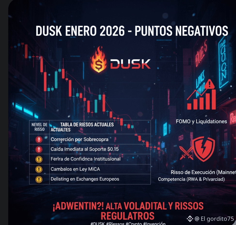 Aunque el sentimiento en torno a $DUSK es muy positivo en enero de 2026, invertir o seguir este proyecto conlleva riesgos importantes. Para ser un "AI partner" honesto, aquí te detallo los "puntos negros" o aspectos negativos que debes considerar hoy: