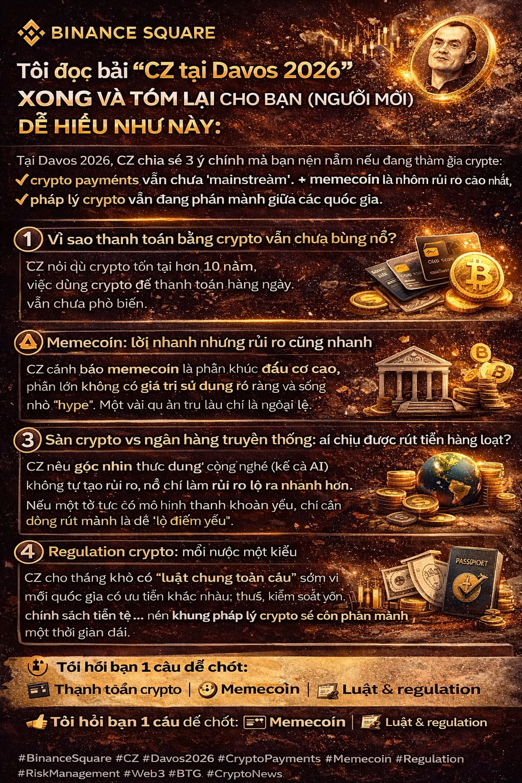 #BinanceSquare #CZ #Davos2026 #CryptoPayments #Memecoin #Regulation #RiskManagement #BTC #DOGE #Web3