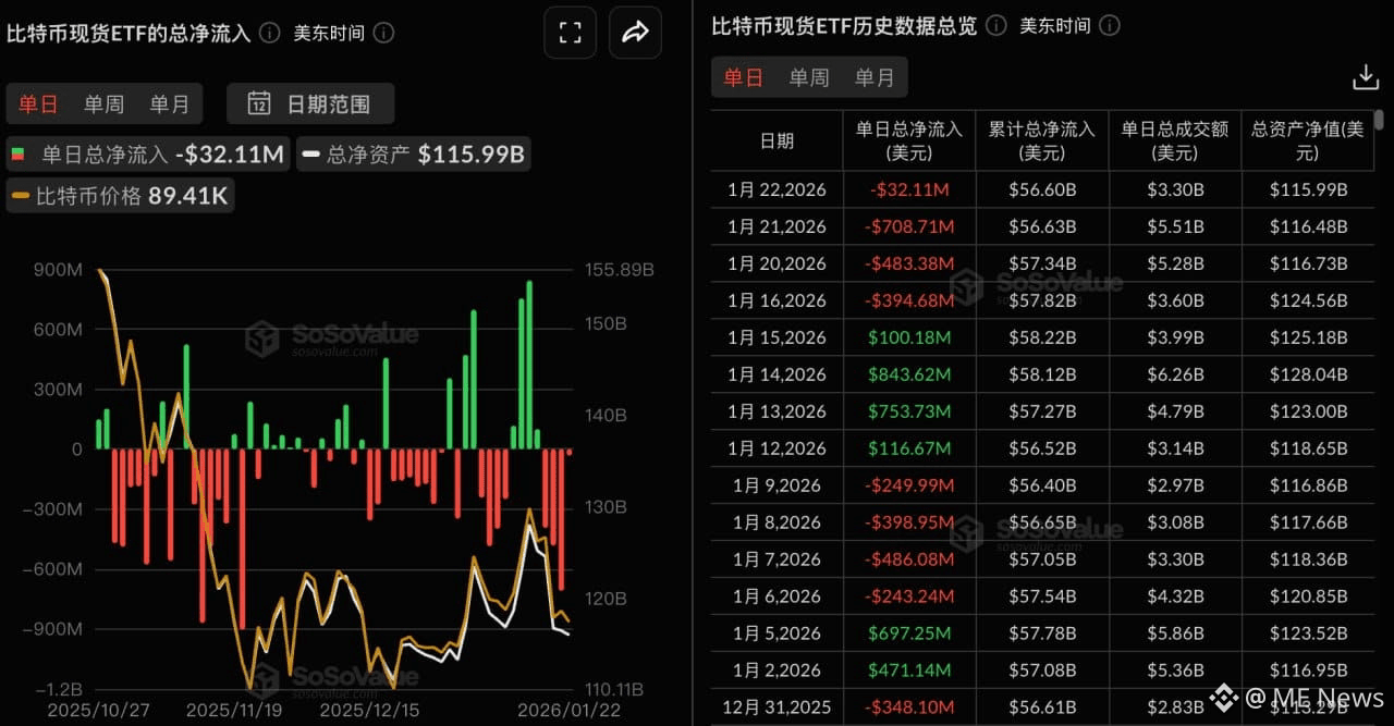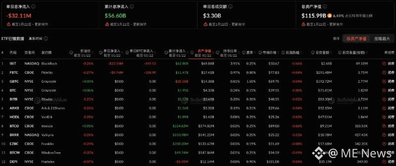 ME News 消息,1 月 23 日(UTC+8),根据 SoSoValue 数据,昨日(美东时间 1 月 22 日)比特币现货 ETF 总净流出 3210.81 万美元。