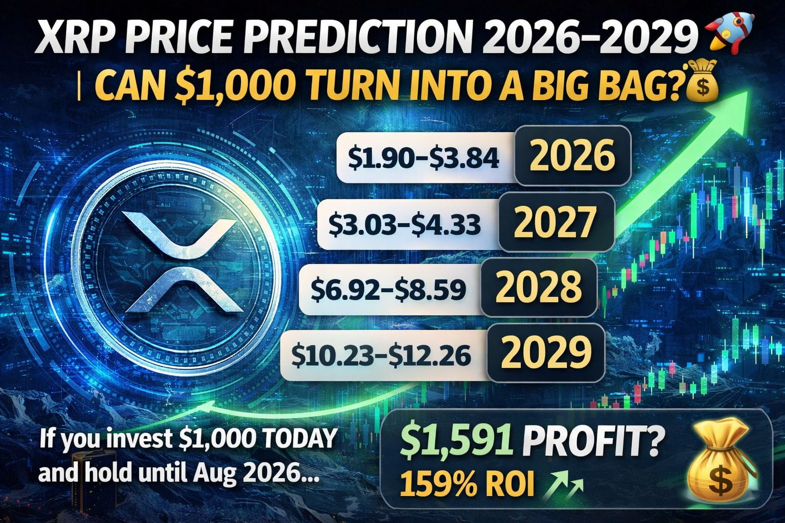 Agar koi investor aaj $1,000 XRP mein invest karta hai aur August 2026 tak hold karta hai, to projections ke mutabiq potential profit $1,591 tak ho sakta hai — jo ke lagbhag 159% ROI banta hai.