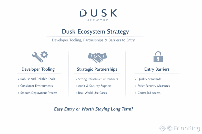 In the end, through the lens of someone who has lived through multiple cycles, Dusk Network’s ecosystem strategy is about trading engineering discipline for long term trust. Tooling turns building into a process, not a game of luck. Partners turn deployment into a reliable supply chain, not a loose collection of connections. Entry barriers protect standards, so the network is not dragged down by its weakest layer. And the question I keep asking the reader is, are you looking for a place that is easy to enter, or a place worth staying in, when the market shifts into a phase where only infrastructure that survives pressure deserves to be called infrastructure.