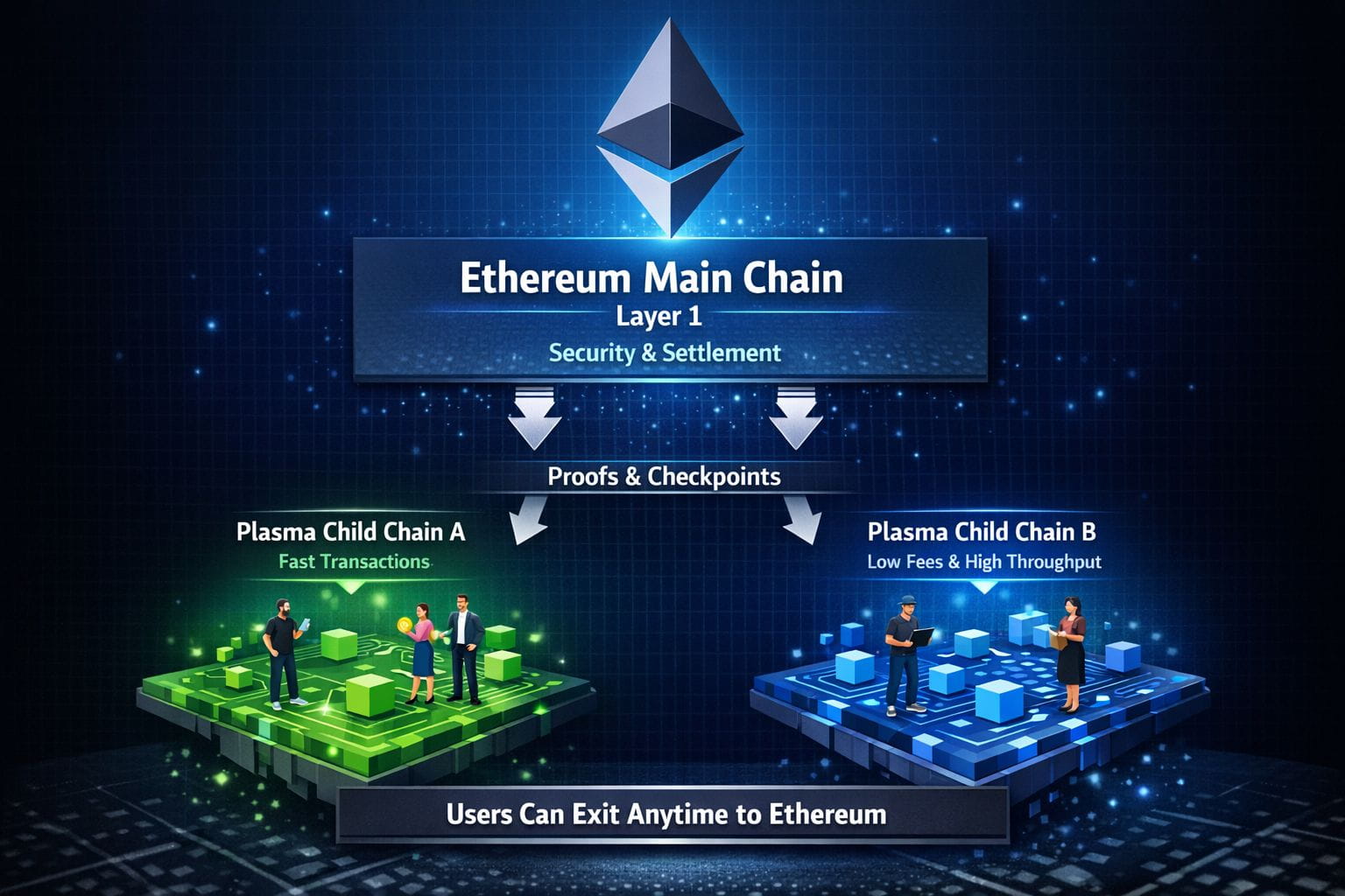 A key feature of Plasma is its exit mechanism. Users can always withdraw their assets back to Ethereum if something goes wrong, ensuring trustless security even if a child chain becomes malicious or inactive.