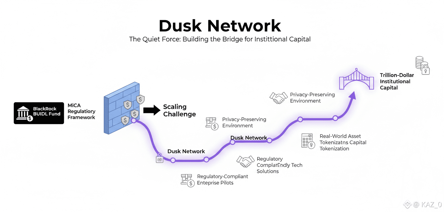 At the heart of today’s shift is tokenization the idea that real world assets can live on chain be traded instantly and settle without the friction of traditional infrastructure. But tokenization isn’t just a buzzword anymore it’s rapidly becoming tangible. We are already seeing this shift in real time. When giants like BlackRock launched their first tokenized fund BUIDL on a public chain the conversation changed. It’s no longer a maybe it’s happening. However the industry is hitting a wall: how do you scale these assets under strict frameworks like MiCA This is where the Quiet Force of Dusk Network becomes a vocal solution. By providing a privacy preserving environment that speaks the language of regulators Dusk isn’t just a playground for crypto natives it’s becoming the bridge for the next trillion dollars of institutional capital.