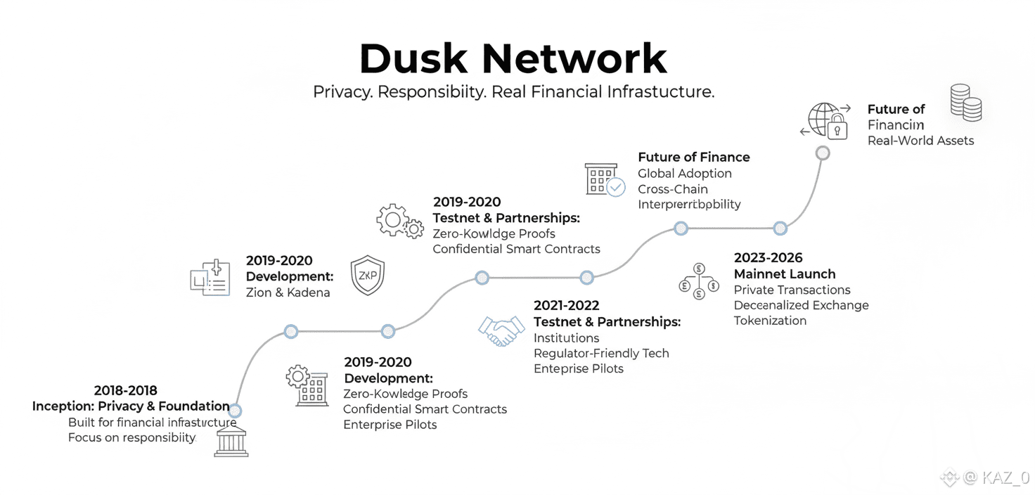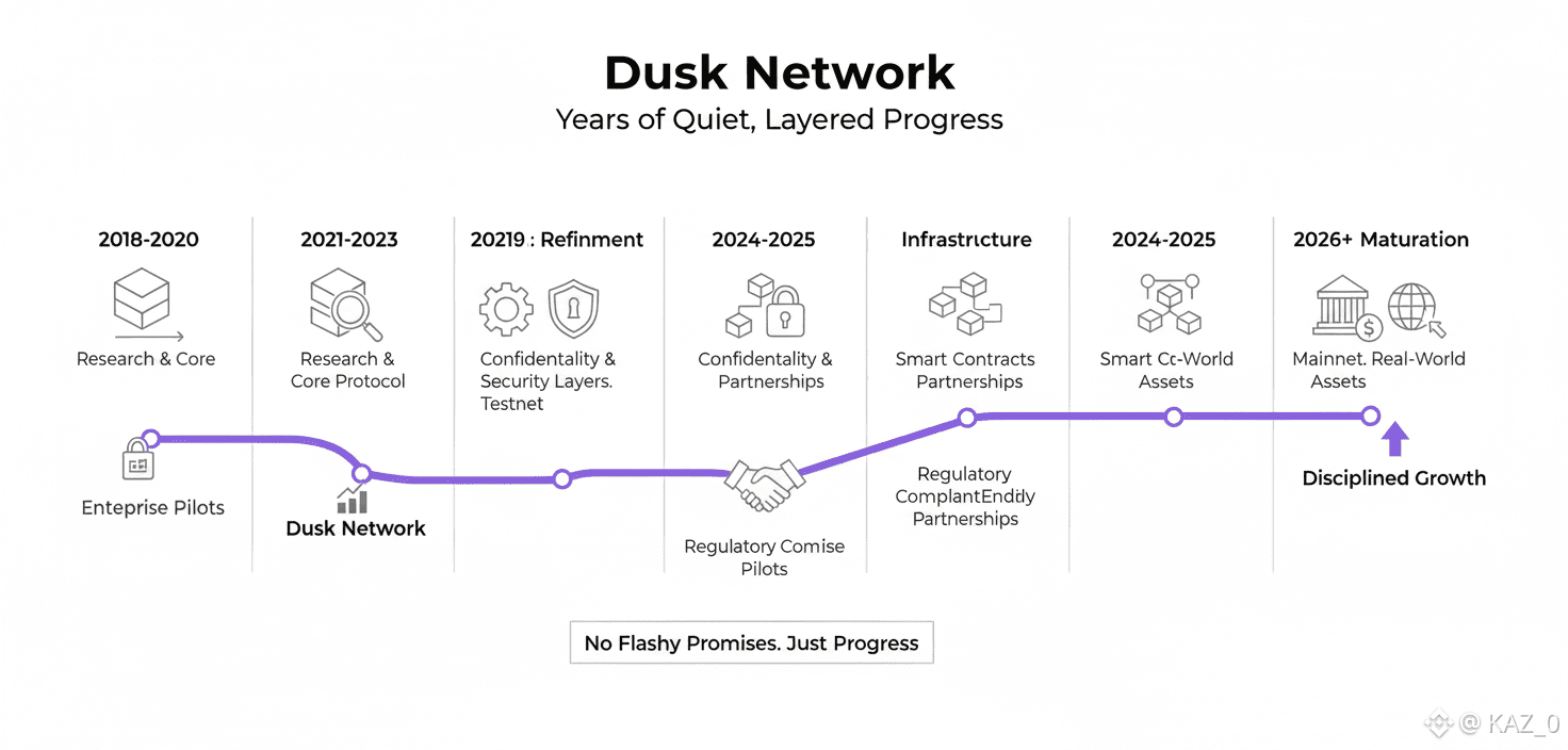 Dusk Network began its journey in 2018 not with noise but with intention. While large swaths of the crypto world chased speed hype and the promise of quick returns Dusk chose a different path one grounded in privacy responsibility and real financial infrastructure. That decision once overlooked now reads less like caution and more like foresight.