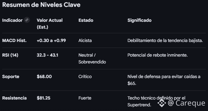 Histograma Positivo: El histograma ha comenzado a tornarse positivo (registrando lecturas de 0.3048 a 0.9946 según la plataforma), lo que indica que el impulso bajista está perdiendo fuerza y podría estar gestándose un giro al alza.