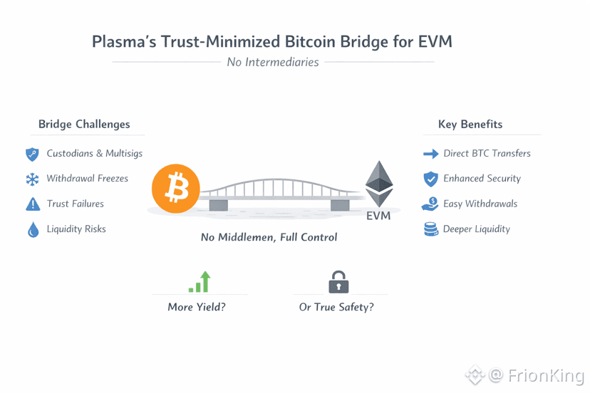 I’ve been in this market long enough to understand one thing, a bridge is not a marketing story, it is a trust test, and in crypto trust always has a price, Plasma announcing a trust minimized Bitcoin Bridge is, to me, a signal they want to take on the hardest part, bring BTC into the EVM environment without forcing users to hand their survival to a group of intermediaries