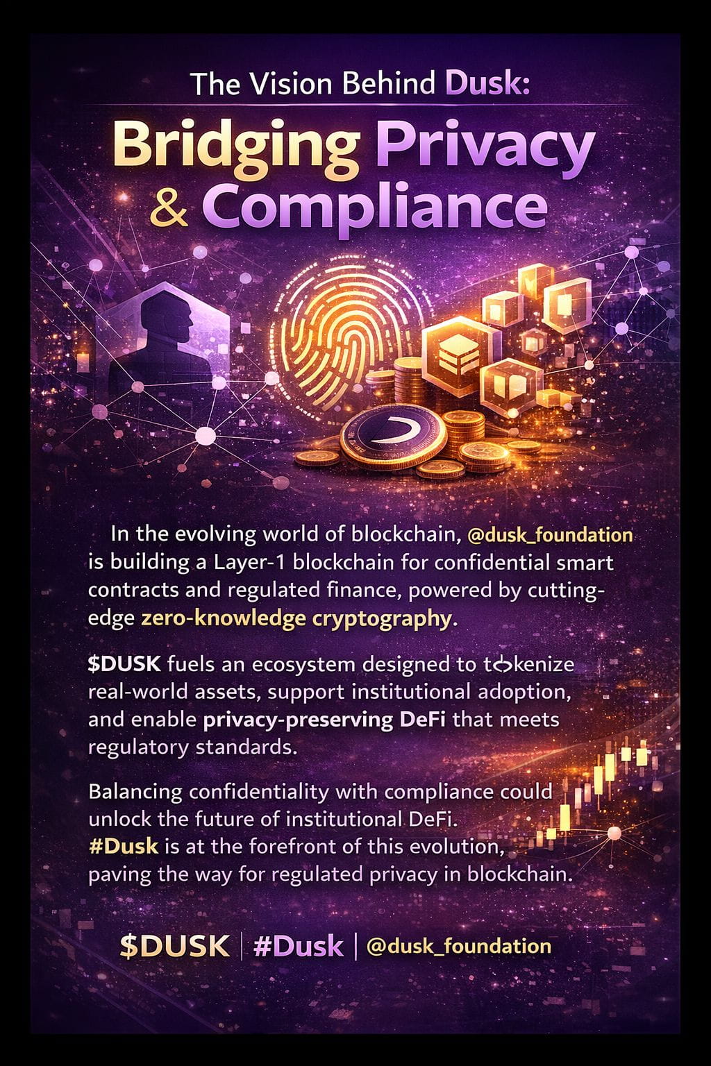 In the evolving world of blockchain technology, one of the most significant challenges has been reconciling the need for privacy with the requirements of regulation and institutional adoption. @dusk_foundation is tackling this challenge head-on by building a purpose-built Layer-1 blockchain that prioritizes confidentiality and compliance, enabling real-world financial markets to operate on chain without exposing sensitive data. Dusk leverages advanced zero-knowledge proof (ZKP) cryptography to provide confidential smart contracts while also supporting regulated issuance, trading, and settlement of financial instruments — including tokenized securities and real-world assets like bonds or IP rights. This approach allows institutions and enterprises to utilize blockchain efficiency and transparency without sacrificing privacy or regulatory obligations. At the heart of the ecosystem is the native token $DUSK, which fuels network operations, secures consensus, and aligns incentives for validators, developers, and participants.