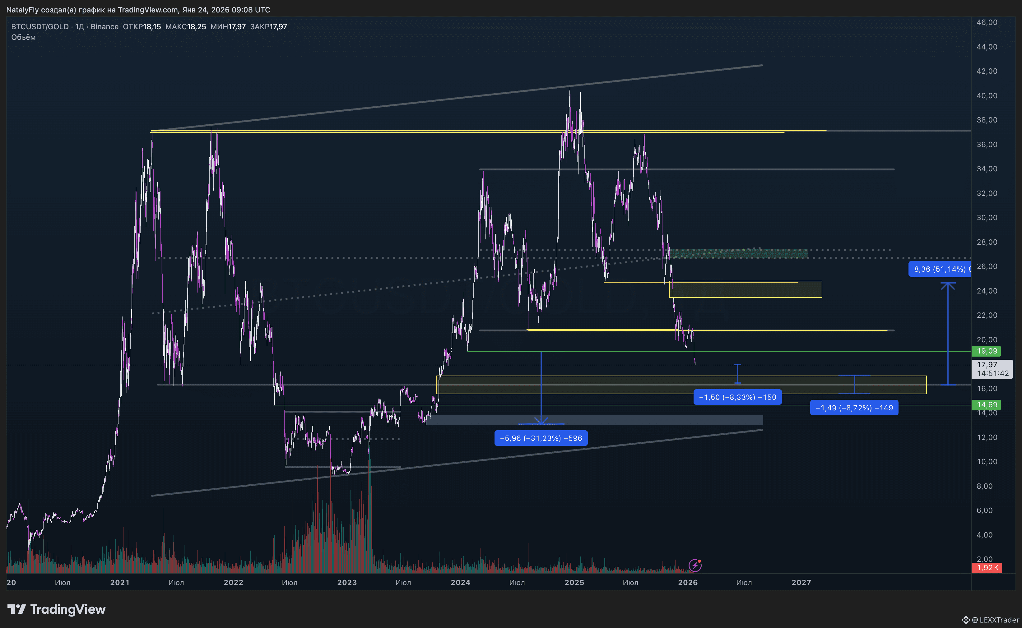 Sometimes the cleanest way to think about Bitcoin is to stop looking at it in dollars and instead compare it to gold — on the BTC/GOLD ratio.
