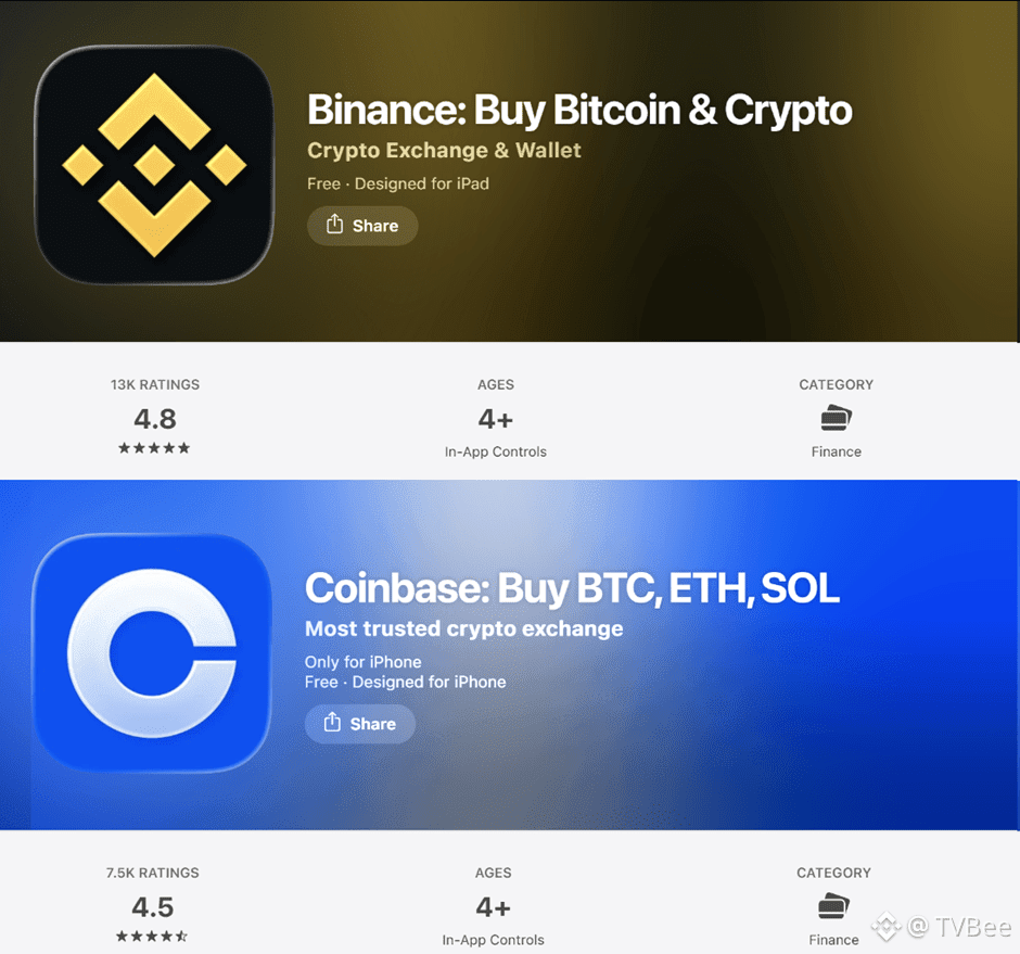 在苹果App Store,币安13000个评价给出4.8分的好评,Coinbase7500个评价综合得分4.5分。