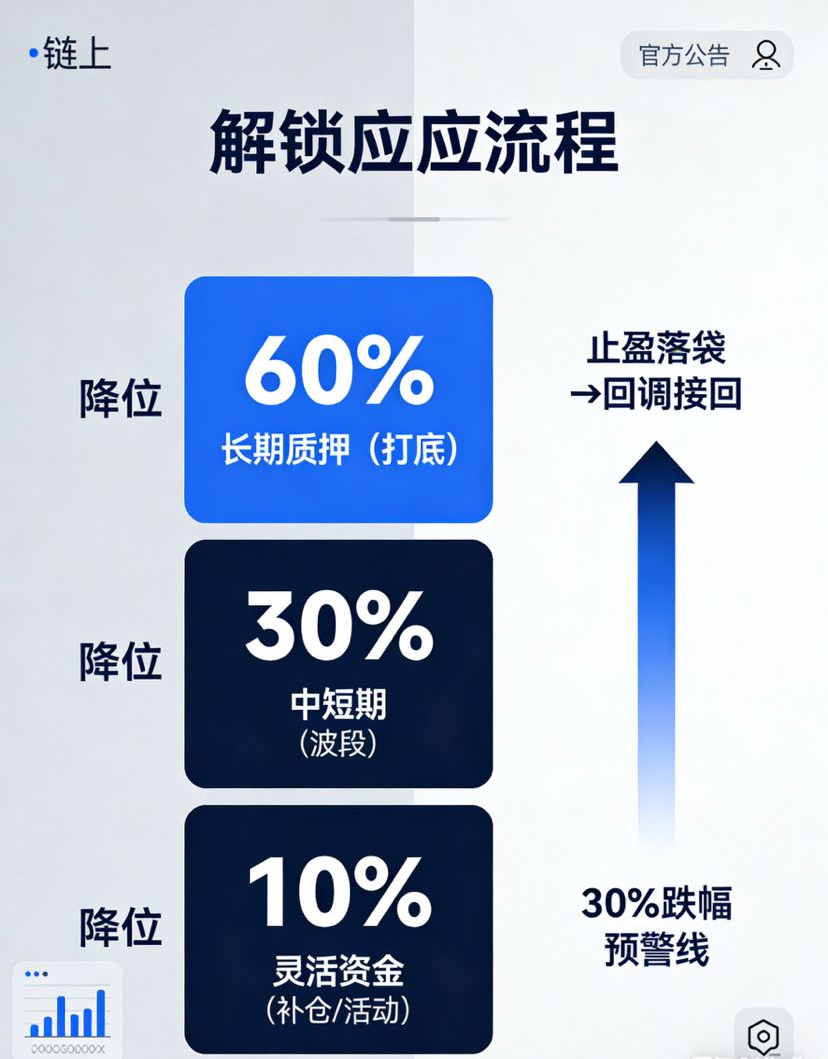 Darüber hinaus habe ich auch einen konkreten Plan zur Bewältigung des Freigabedrucks im Juli nächsten Jahres festgelegt: Vor der Freigabe im Juli 2026 werde ich die Hälfte meiner mittelfristigen Bestände abstoßen, um Gewinne zu sichern und einen Teil des Gewinns in die Hand zu bekommen. Nachdem ich den Rückgang nach der Freigabe beobachtet habe, werde ich basierend auf den Preisbewegungen von Coins und den Kernzahlen des Ökosystems schrittweise Kapital zurückholen, ohne zu viel zu erwarten, sondern einfach auf Stabilität zu setzen. Ich habe auch eine Warnlinie gesetzt: Wenn der Preis nach der Freigabe um mehr als 30% fällt, werde ich schrittweise nachkaufen. Wenn die Kernzahlen des Ökosystems, wie Transaktionsvolumen, Staking-Menge und Anzahl neuer Benutzer, sinken, werde ich entschlossen meine Position reduzieren und rechtzeitig Verluste begrenzen, ohne auf Glück zu setzen.