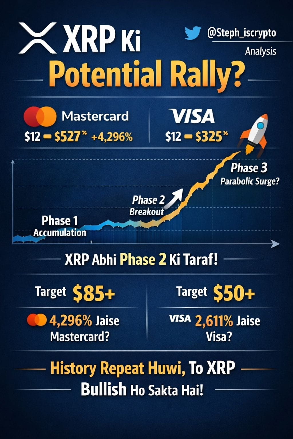 Krypto-Analyst Steph Is Crypto (@Steph_iscrypto) hat kürzlich ein Diagramm geteilt, das den aktuellen Preisbewegungen von XRP mit den historischen Aktienmustern von Mastercard und Visa vergleicht.