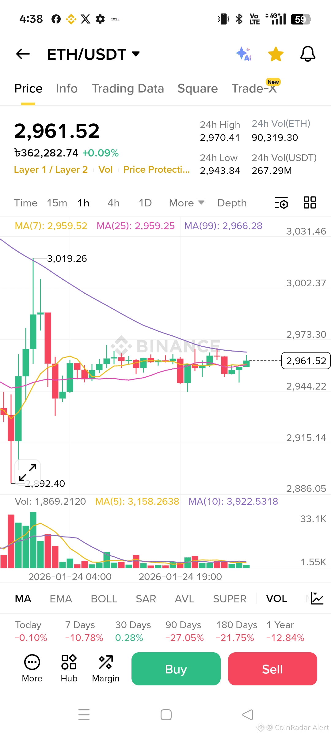 On the 1-hour chart, Ethereum is showing classic signs of building tension right now—price has been squeezing into a narrow consolidation band between roughly 2950 and 2970, with repeated pokes higher getting smacked down hard around that 3020 level, where supply seems to be waiting patiently. The moving averages are all flattening out and bunching up together, which tells us the market is catching its breath after that earlier volatility explosion; this isn't the start of a fresh breakdown, it's more like a coiled spring getting ready for the next real move.