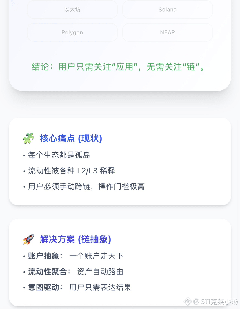 在目前的 Web3 世界里,新手体验很差需要学习很多避坑知识。链抽象就是要把这些底层脏活儿全部打包,让用户快速应用不同公链。