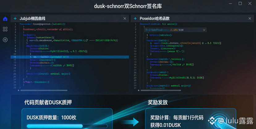 我研究Dusk Foundation的DUSK代币,始终绕不开一个核心感受:它和其他隐私公链代币的本质区别,从来不是所谓的生态布局或应用落地速度,而是把通证的所有设计逻辑,都嵌进了整个网络的密码学底层和协议层架构里。我翻遍了Dusk团队在GitHub上开源的所有密码学库,从dusk-schnorr到piecrust-uplink,对着Rust代码一行行拆解双Schnorr签名的实现逻辑,也在测试网里反复模拟Moonlight和Phoenix两种交易模型的运行机制,甚至核对过SBA共识节点的选举和奖励分配数据,越研究越发现,DUSK从来不是单纯的价值载体,而是支撑整个Dusk Network实现隐私与合规平衡的原生技术组件,它的每一次流通、质押、消耗和奖励,都和网络的密码学运行、协议层安全深度绑定,这种融合不是写在白皮书里的概念,而是实实在在藏在每一行代码、每一个密码学原语里的现实。在我看来,这才是DUSK最核心的价值,也是它能在隐私合规赛道里走出差异化的关键。很多隐私公链把零知识证明、隐私交易当作附加功能,通证只是用来支付手续费或质押挖矿的工具,而Dusk则反其道而行之,让DUSK成为了所有隐私合规技术落地的必要前提,没有DUSK的原生参与,整个网络的密码学验证、共识机制、身份合规体系都无法正常运行,这是我研究下来最直观的感受。