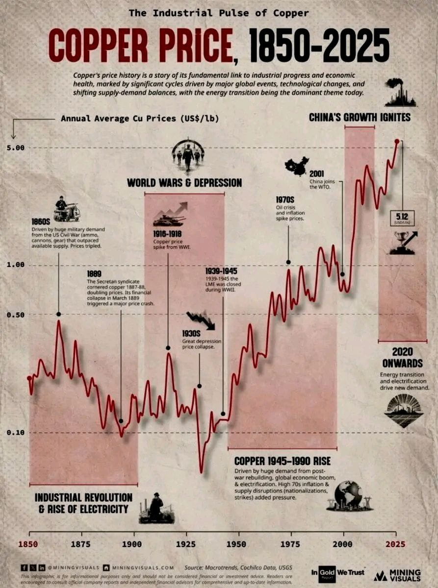 Von der Industriellen Revolution der 1850er Jahre bis zum Elektrifizierungsboom der frühen 1900er Jahre hat Kupfer konsequent als Rückgrat des wirtschaftlichen Fortschritts fungiert. Jedes Mal, wenn die Welt in eine neue Wachstumsära eintrat, folgte die Nachfrage nach Kupfer.