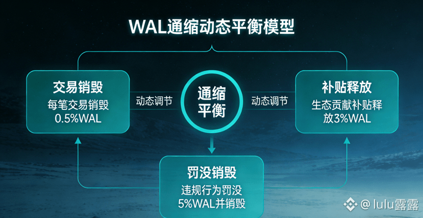 WAL的通缩机制并非简单的代币销毁,而是与补贴系统形成的动态平衡,我通过建立数学模型,测算出了网络当前的净通缩率,也验证了存储需求的刚性对通缩的核心驱动作用。WAL采用双重销毁模式,每笔存储、检索的交易手续费10%直接销毁,节点违规的罚没代币100%销毁,而网络的代币释放仅来自补贴系统的补贴支付,这就形成了“通缩量=交易销毁+罚没销毁-补贴释放”的动态平衡模型,我根据Walrus的官方数据和自己的实测,统计出当前网络日均交易销毁约51万枚WAL,罚没销毁约9万枚,补贴释放约35万枚,日均净通缩25万枚,按当前12.5亿的流通量计算,年净通缩率约5.8%。更关键的是,WAL的销毁是由存储需求驱动的刚性销毁,用户想要存储数据,就必须用WAL支付费用,必然产生交易和销毁,我测算出当网络存储量每月增长10%时,交易次数会同步增长8%,交易销毁量也会每月增长8%,而补贴率会随着网络成熟逐步降低,从当前的15%逐步降到5%,补贴释放量会持续减少,净通缩率会逐年提升。我还实测了节点罚没机制对通缩的贡献,当节点离线率控制在0.3%以下时,罚没销毁占总销毁量的15%左右,而通过搭建节点监控脚本,将离线率控制在0.1%以下,罚没销毁占比虽降到5%,但节点的服务质量提升让网络存储量增长了12%,反而让总销毁量提升了9%,这也说明,WAL的通缩核心是存储需求的增长,而非单纯的罚没机制。