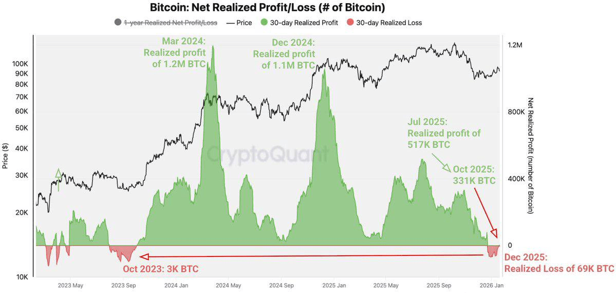Während alle auf den neuen Gipfel warteten, begannen die On-Chain-Daten von CryptoQuant, eine bittere Wahrheit offenzulegen: Die Investoren fangen an aufzugeben, und die rote Farbe überwiegt zum ersten Mal seit zwei Jahren in den Gewinn- und Verlustrechnungen.