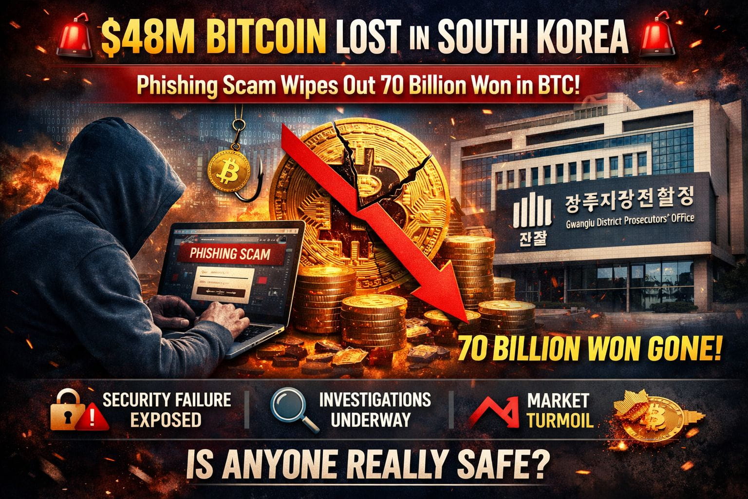 A fake website led to stolen wallet access, and nearly 70 billion won worth of BTC disappeared. The issue came to light during an internal audit at the Gwangju District Prosecutorsâ Office, revealing weaknesses in how seized crypto is stored.