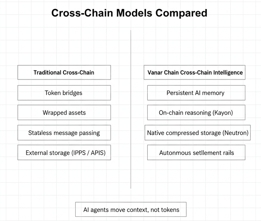 Traditionelle Cross-Chain-Infrastruktur behandelt jede Chain als isoliert. Du sperrst Tokens hier, mintest eingewickelte Versionen dort, vielleicht übermittelst du Nachrichten, wenn du fancy bist. Aber KI-Agenten bewegen keine Tokens. Sie bewegen Kontext, Gedächtnis und Entscheidungszustand. Das ist ein völlig anderes Problem.