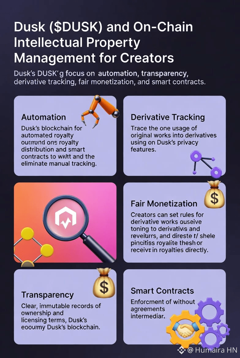 In conclusion, my experience with @Dusk and $DUSK has shown me that on-chain IP management is more than just a technical tool,it’s a paradigm shift for creators. By combining automation, transparency, derivative tracking, and fair monetization, Dusk empowers creators to control their work like never before. It reduces friction in collaboration, ensures fair compensation, and opens doors to innovative licensing and funding models. For creators participating in Creator Pad, this represents a practical, immediately useful solution that supports long-term growth and creative freedom.