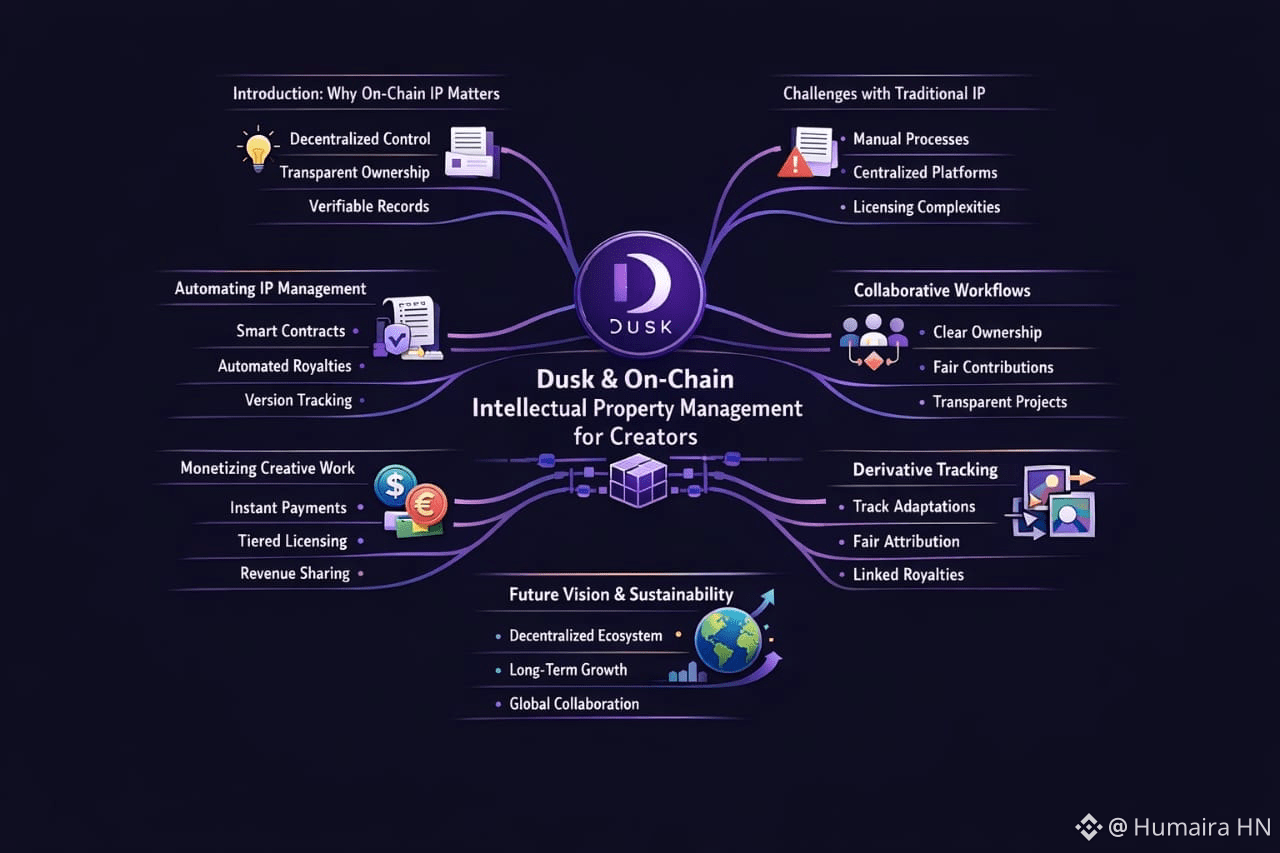 In my experience exploring @Dusk and $DUSK , one of the most compelling aspects is its potential to redefine how creators manage intellectual property (IP) on chain. As a creator, I’ve often faced the challenge of keeping track of rights, usage permissions, and licensing terms for my digital work. Traditionally, this has relied on manual contracts, legal documents, or centralized platforms, all of which are prone to errors, disputes, or even misuse. With Dusk, I can see a future where creators control IP management directly through decentralized, programmable systems, reducing friction and ensuring transparency.