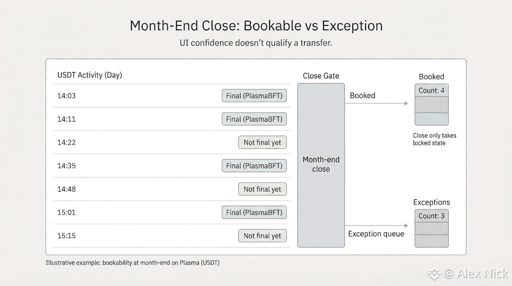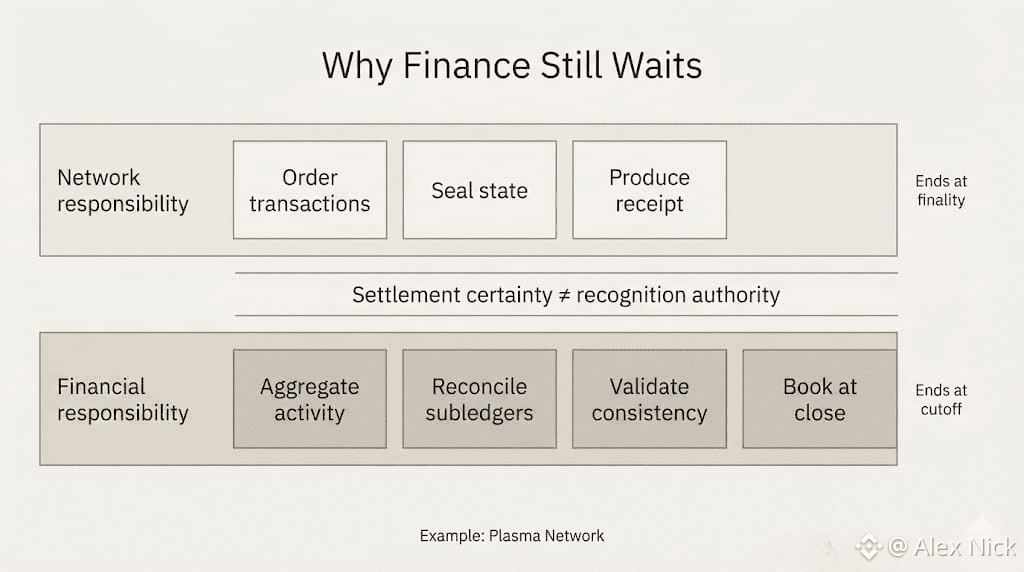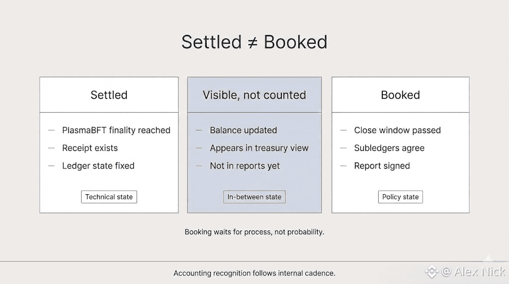 I keep thinking about how odd that feels. The payment is real. The balance updates. The funds are visible. Yet the accounting system still says “not yet.” Not because anyone doubts Plasma. Not because there is uncertainty. But because finance does not move on transaction speed. It moves on time windows.