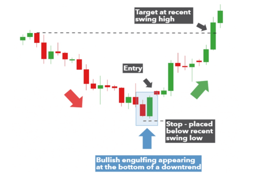Das bullish engulfing pattern besteht aus zwei Kerzen. Sobald eine engulfing Kerze entsteht, übernehmen die Bullen den Markt, was bedeutet, dass der Markt an Schwung gewinnt. In diesen Situationen wird empfohlen, zu kaufen.