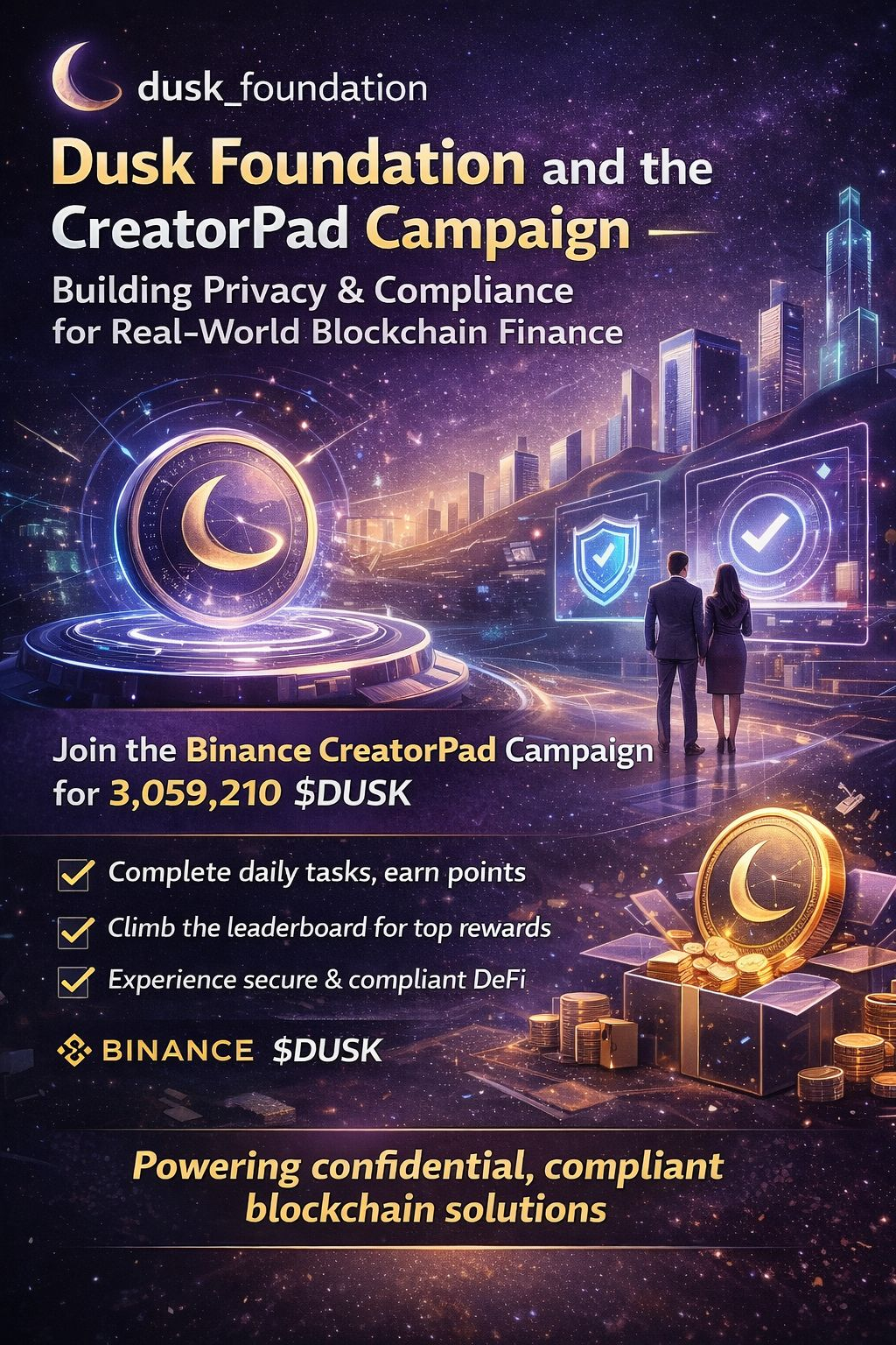 Eine aufregende Möglichkeit, wie die Gemeinschaft sich gerade jetzt beteiligen kann, ist durch die Binance CreatorPad-Kampagne. Mit einem Gesamtpreis von über 3 Millionen $DUSK können die Teilnehmer tägliche Aufgaben abschließen, Punkte verdienen und sich in der Rangliste hocharbeiten, um um Belohnungen zu konkurrieren. Diese Kampagne bietet den Nutzern nicht nur die Chance, $DUSK zu verdienen, sondern verbreitet auch das Bewusstsein für das Ökosystem und ermutigt mehr Entwickler, Kreative und Enthusiasten, zu lernen, was Dusk besonders macht. �