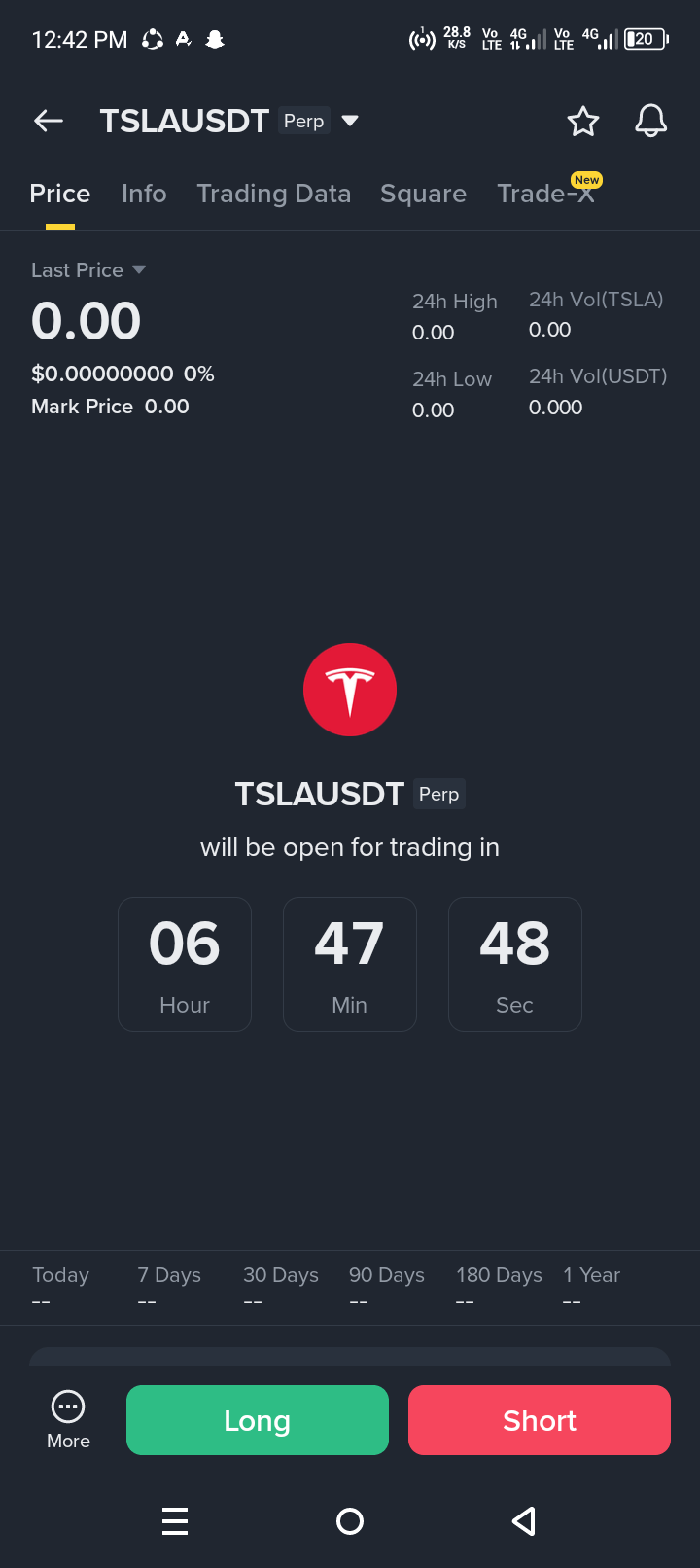 Der Handel für TSLAUSDT öffnet bald - nur noch 6 Stunden! 👀 Der aktuelle Preis liegt bei 0,00, mit einem 24-Stunden-Hoch und -Tief, die getestet werden müssen. Ist dies Ihre Chance, früh einzusteigen? 😎 Überprüfen Sie die App auf Kauf-/Verkaufsoptionen und halten Sie sich bereit