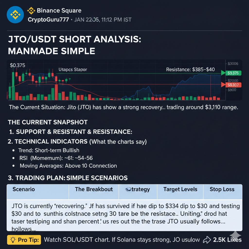 * Widerstand (Die Decke): $0.385 – $0.40. Dies ist die unmittelbare "Mauer." JTO benötigt einen starken Anstoß (mit hohem Handelsvolumen), um über $0.40 zu brechen und einen echten Bullenlauf zu bestätigen.