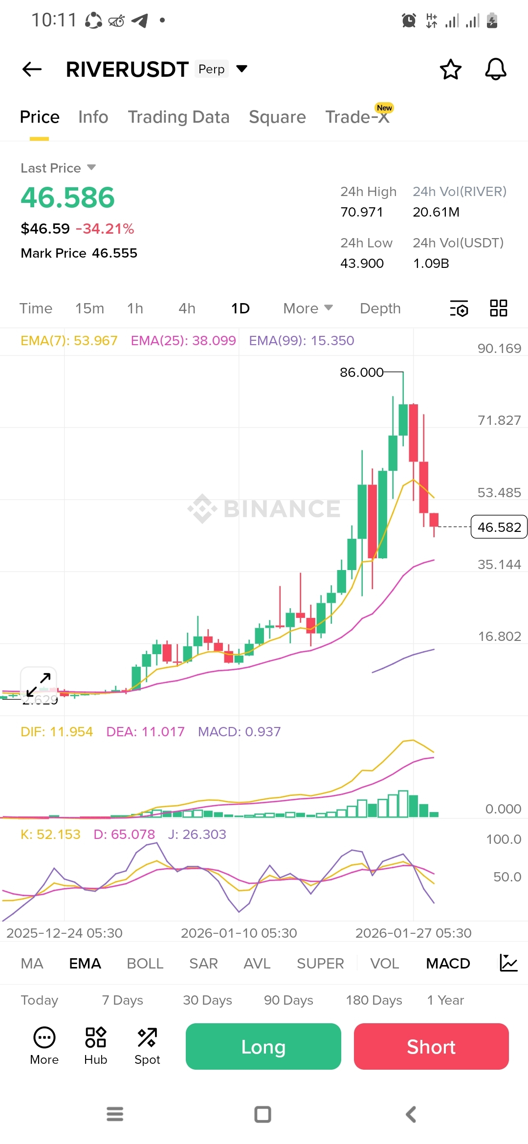 RIVERUSDT hat eine extreme impulsive Rally erlebt, gefolgt von einem scharfen Korrekturrückgang von mehr als -32% vom jüngsten Höchststand. Diese Art von Bewegung ist typisch nach parabolischer Preiserweiterung, insbesondere bei neuen oder illiquiden Token.