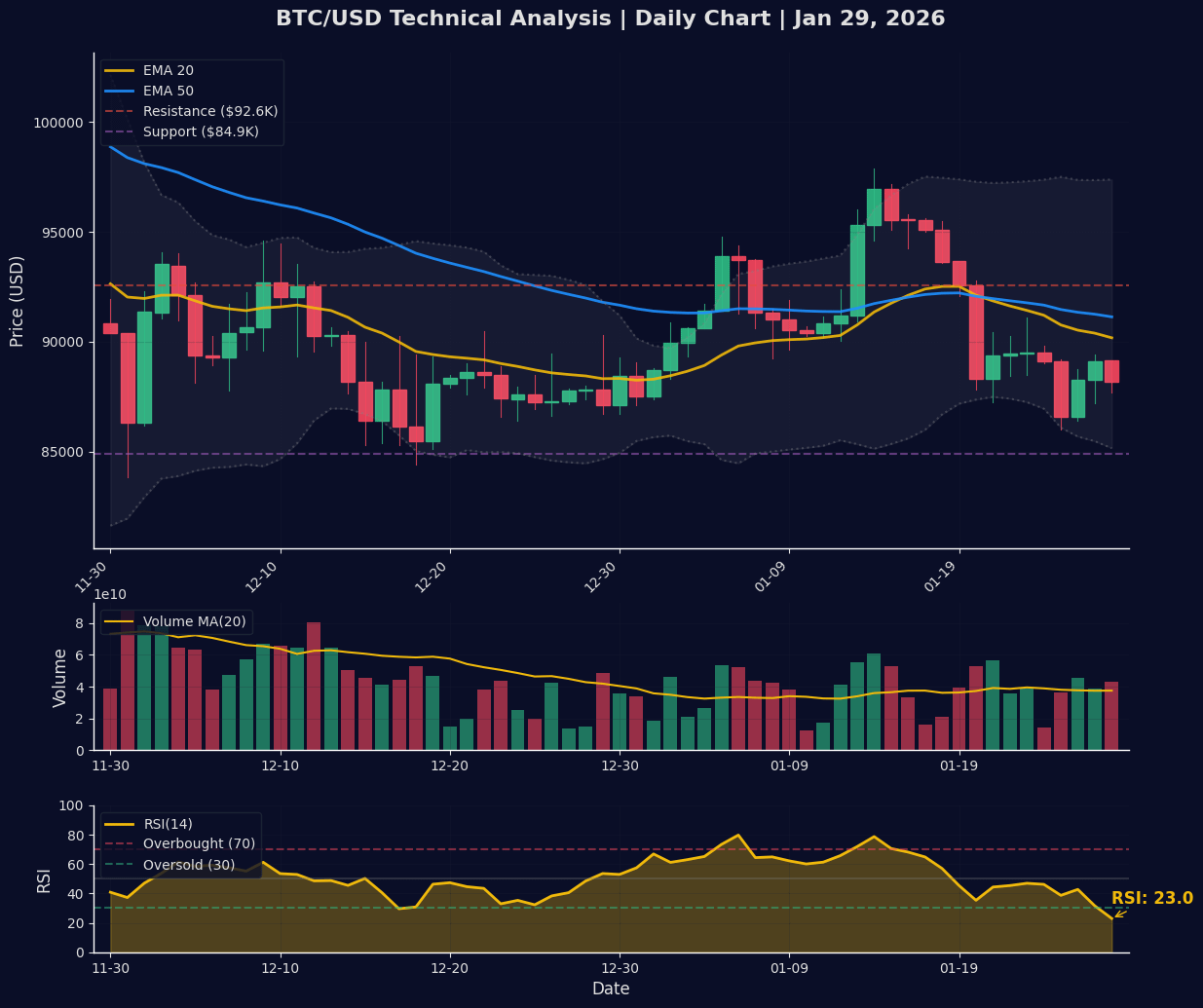 Wir sind kurzfristig überverkauft, aber in einem technischen Abwärtstrend. Das ist eine Pulverfass-Konstellation. Ein Erholungsbump zu $92K-$95K ist nicht nur möglich – es ist statistisch wahrscheinlich, angesichts dieses RSI-Werts. Aber heirate nicht deine Taschen.