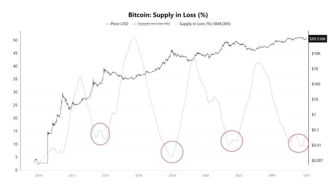 Der 365-Tage-Durchschnitt von CryptoQuant über den Anteil der Versorgung in Verlusten beginnt zu steigen. In einfachen Worten: Immer mehr Coins haben einen Kostenpreis, der über dem aktuellen Marktpreis liegt. Das ist nicht nur kurzfristiges Verlieren für Kleinanleger, sondern der Verlustbereich dringt von Spekulanten zu langfristigen Haltern vor.