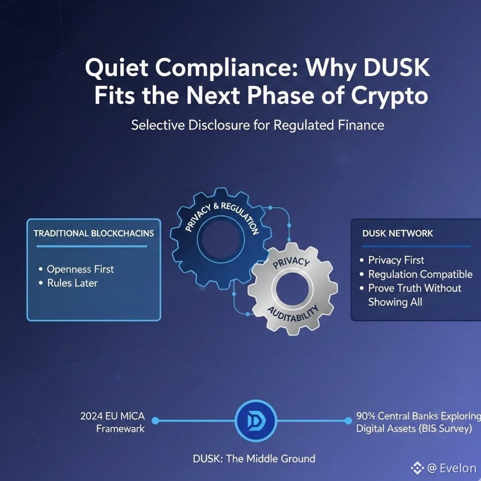Looking ahead, two trends are becoming clear. First, regulators do not equate privacy with secrecy. Traditional privacy coins pursue anonymity at all costs, often putting them at odds with compliance. Dusk’s selective auditability aligns with regulatory expectations: protect sensitive information while proving adherence to rules. Second, adoption will be driven by solutions, not narratives. Markets will favor blockchains that integrate with existing legal, custody, and reporting systems, minimizing operational risk rather than maximizing ideological purity.