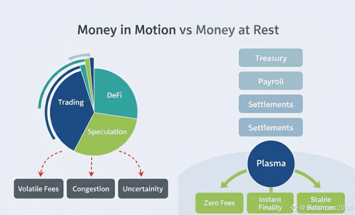 Most blockchain chatter obsesses over speed—faster txns, insane TPS, non-stop action. But flip that script: what keeps money still? Real finance thrives on idle cash in treasuries, payroll buffers, merchant floats, savings vaults. Banks, payment rails, accounting ledgers? Built for that dormancy. Plasma flips crypto's game by embracing stillness over frenzy. $XPLOne tweak changes it all. Typical chains treat you as a trader: fees spike with congestion, finality's a dice roll. Finance teams hate that uncertainty—auditors demand proof. Plasma sees users as balance-sheet operators. No market pumps, just boring reliability: predictable costs, ironclad finality. PlasmaBFT seals txns forever—no reorgs, no prob stats.It splits economic risk from activity. Other chains? More use = more fees, network strain, settlement roulette. Plasma? Zero-fee stablecoin zips (USDT shines here), usage never warps costs. Businesses win: payroll won't glitch on "network busy" excuses. Regulators nod at steady accounting. No TradFi flaws like central chokepoints.Plasma's the neutral spine linking chains. Settle balances legible here, park assets elsewhere. Think clearinghouses, not app-hosting arenas. Borrows Bitcoin's trust (slow but solid) for efficiency underneath. Faith in BTC, action on Plasma—rare crypto alchemy.Privacy? Not dark-web hiding, but noise reduction. Finance hides salaries, vendor pays, internal shifts. Plasma defaults confidential, verifies on demand. Compliance-friendly, not combative.Cognitive ease is underrated. Gas guesses? Bridge hell? Liquidity splits? Gone. Plasma just works—adoption sneaks in.