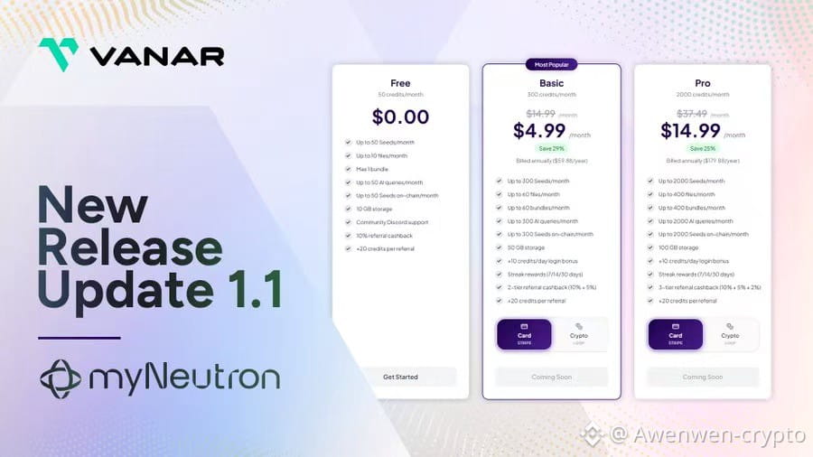 这带来的差距是碾压级的。后期改造的链,上下文容易丢失,代理每次交互都要重新“自我介绍”,效率低下,成本高企。Vanar的myNeutron直接在基础设施层实现了语义记忆和持久性AI语境——代理记住上一次对话的内容、用户的偏好、甚至跨会话的历史,就像真人一样流畅。