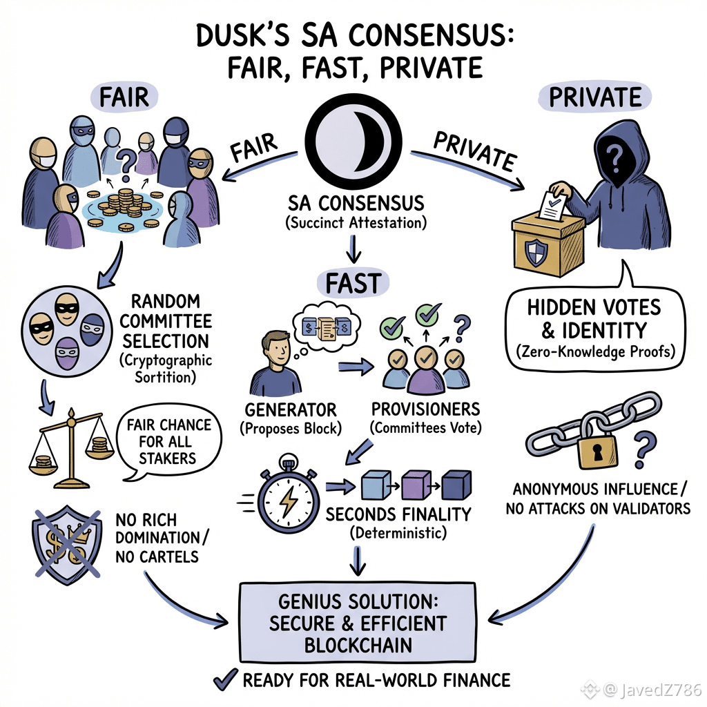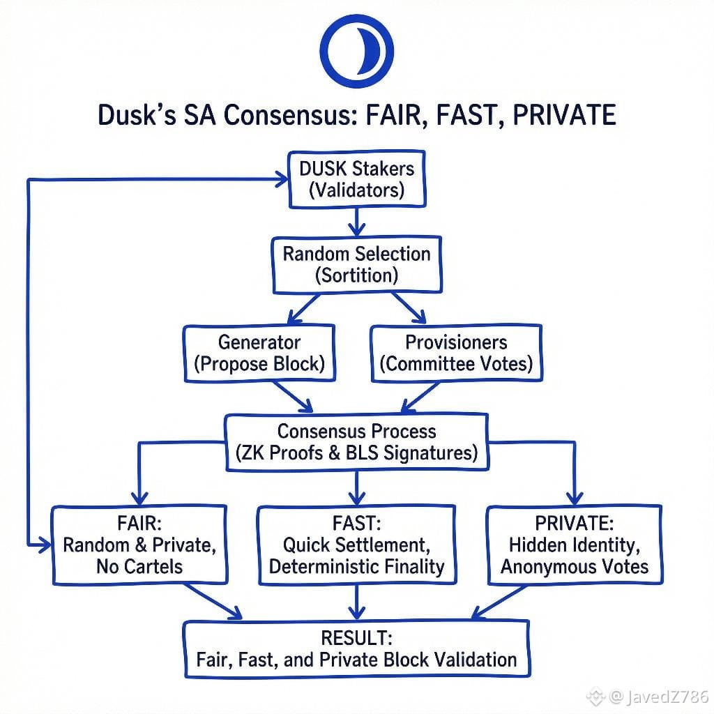 Why this fair?Because selection is random and private. Big players cannot control always. No one know who validate next block so hard to bribe or attack specific people. It prevent cartel or big group take over. Everyone with stake have fair chance. Rewards come based on stake size but probabilistic so fair.Why fast?SA is designed for quick settlement. Blocks finalize in seconds not minutes. Good for finance things like trading stocks on chain. No wait long time like Bitcoin. Dusk want help real money world like regulated finance. So speed important.Why private?This best part! In normal blockchain, people see who vote or who propose. Bad guys can target rich validators or censor some. But in Dusk, votes hidden with zero-knowledge proofs. You prove your vote valid without show who you are or what you vote. No one see your identity or how much influence. This protect privacy of validators. Also transactions private with zero-knowledge.Dusk build for privacy from start. Not add later. It use things like PLONK for zk proofs. Consensus also use BLS signatures to aggregate votes so less data and fast.Because of this, Dusk good for institutions. Banks or companies want privacy but follow rules. Dusk give both.I think SA Consensus is genius. It solve big problems:Fair: Random private selection stop rich dominate.